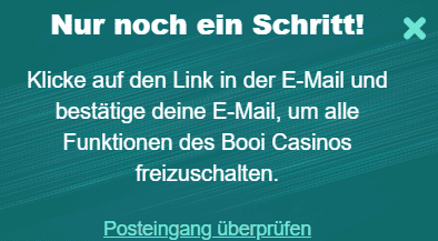 Nach der Anmeldung versendet das Booi Casino eine Bestätigungs-E-Mail. Erst wenn man den Link in dieser E-Mail anklickt, wird das Konto aktiviert und der Bonus freigeschaltet.